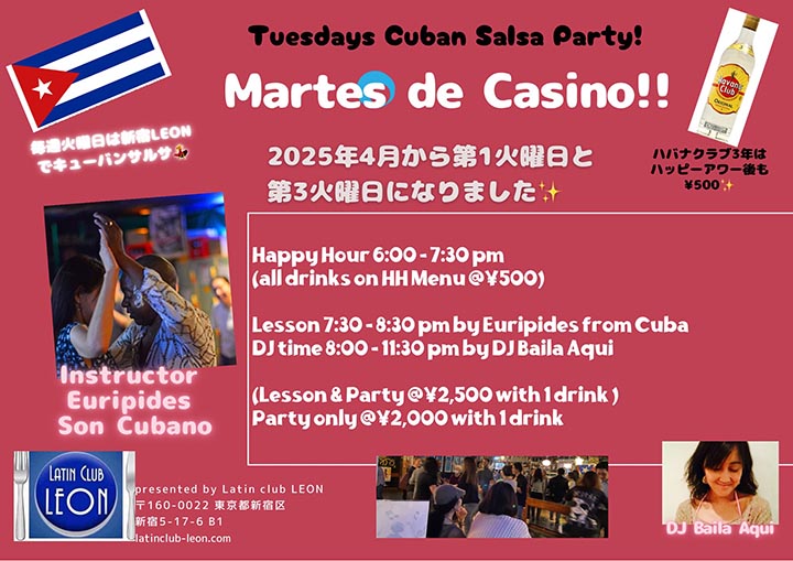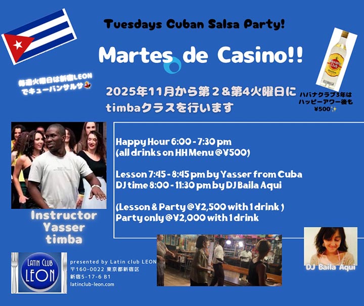 毎週火曜日はラテンクラブ新宿Leonでキューバンサルサを楽しみましょう。こだわりのレッスンと選曲でお待ちしています。